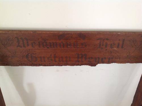 Wooden gun rack made by POWS in 1918 at Fort Napier, Pietermaritzburg. German hunting inscription " Weidmans Heil", with name Gustav Weyer. Bottom ammunition box inscribed "Patrone Kasten". Oval inscription at back, Fort Napier, Natal, Camp 2, 1918.