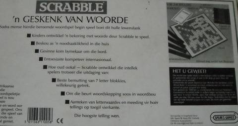 This Scrabble in Afrikaans set (made in England!!) is in excellent condition. Inside the box is the board, bag with letter blocks and 4 plastic holders for the letter blocks. Instructions on back of box. Postage R35 as the box is large.