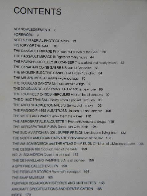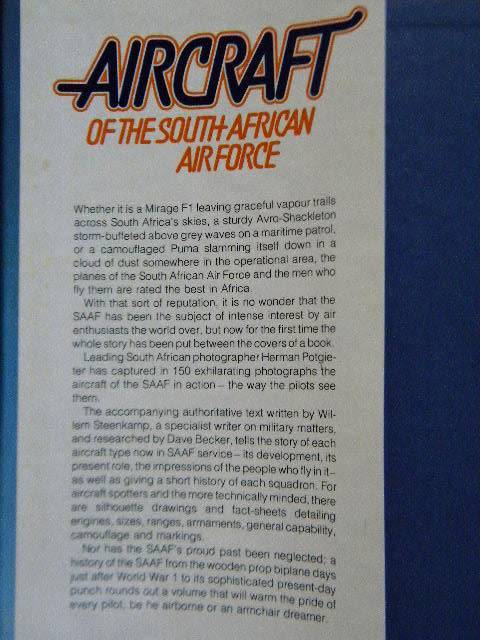 Size A4. Hardcover with d/j. Solidly bound and clean inside. First edition 1980 by Struik with 180 pages and beautifully illustrated. Scuff marks at top and bottom of spine. D/j slightly damaged at top of spine. Foxing on end pages.There are more illustrations of squadron badges of the SAAF on the last end page. Postage in RSA = R62.00.