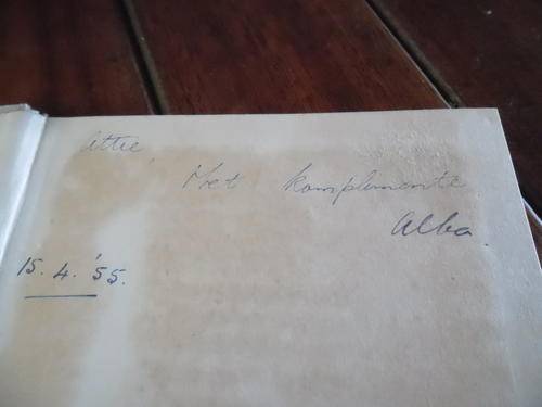 Inskripsie op eerste lee bladsy lees. 1955 met komplimente Alba (die skrywer) (sien fotos).
