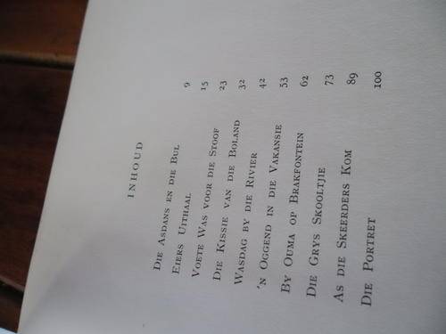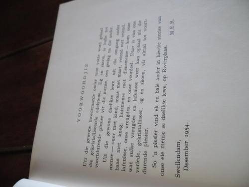Voorwoord MER Swellendam 1954. "Stories van ons eie mense se daelikse lewe op Rivierplaas". Stories soos Asdans en die bul, eiers uithaal, voete was voor stoof, kissie van die Boland, wasdag by rivier, ouma op Brakfontein, as die skeerders kom ens.