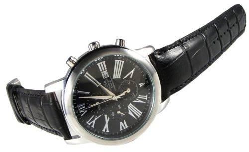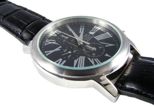 SEIKO/ALBA quartz 7T92/YM92 CHRONOGRAPH movement measures up to 12 hours in 1/20 sec increments. Full stainless steel construction with brushed and polished case and screw in case back. Black dial with reflective steel hands and Roman numerals. 3 Sub dials for chronograph functions, with silver increments. Elapsed minute scale on outer part of dial. Date display at 3 o'clock. 50m/5bar water resistance. Flat formed scratch resistant Hardlex crystal glass. Black textured genuine leather band with polished stainless steel buckle. | |