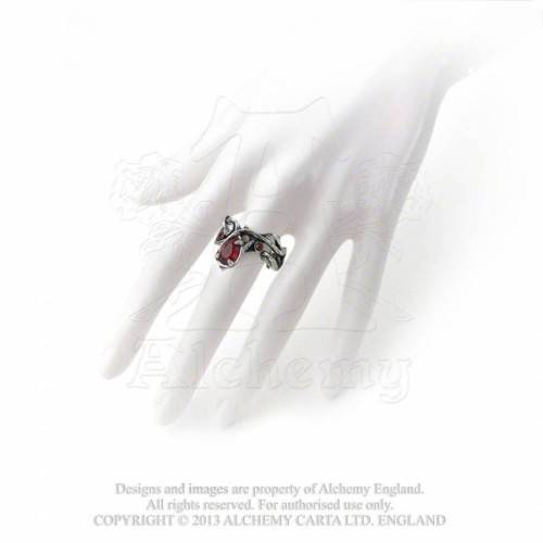 A delicate pewter ring of tangled thorns, set with red and white Swarovski crystals.
