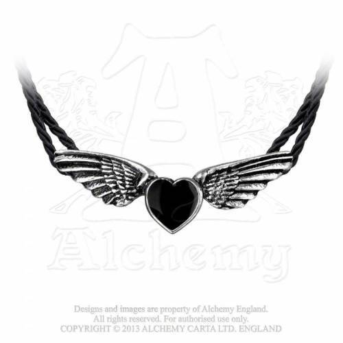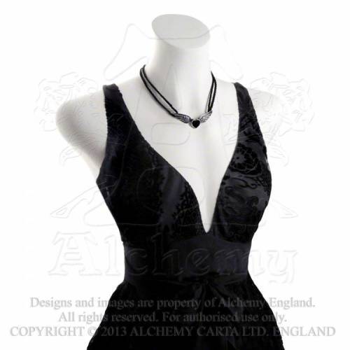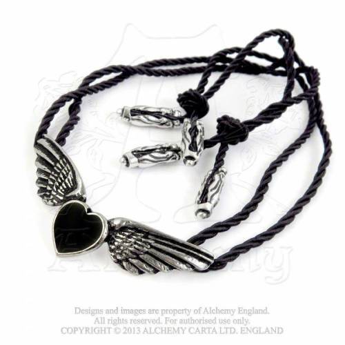 A small, pewter winged-heart choker on doubled, soft black cord with pewter finals.