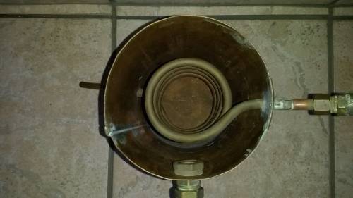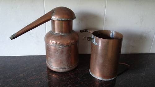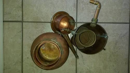 Copper alcohol still (distiller). The pot has approximately a 4 liter volume. The still is entirely made from copper. The pot with cap is approximately 30cm high. The pot diameter is approximately 18cm.