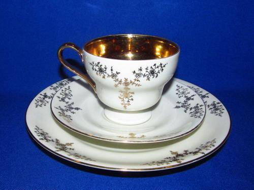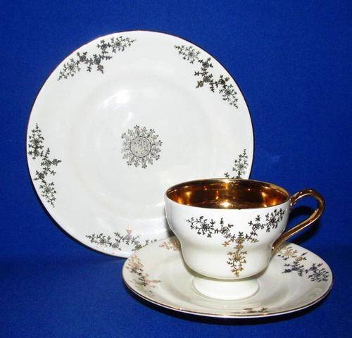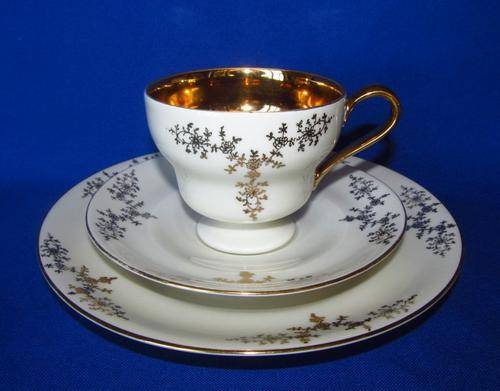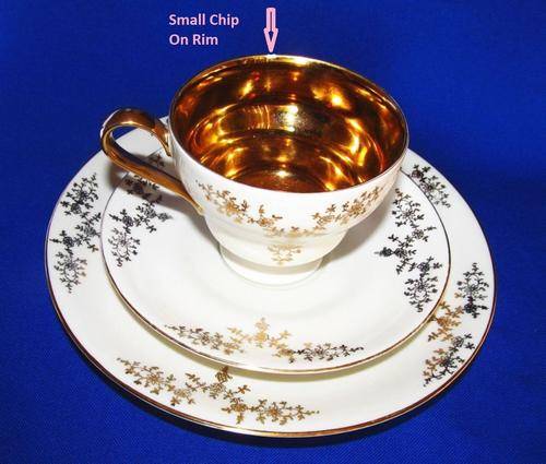 This Trio with gold detail is in excellent condition apart from a small chip on the cup rim and ever so slight gilding loss on the central plate motif.
