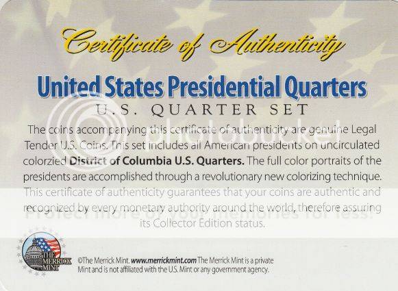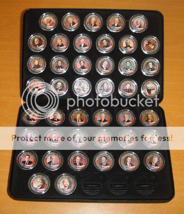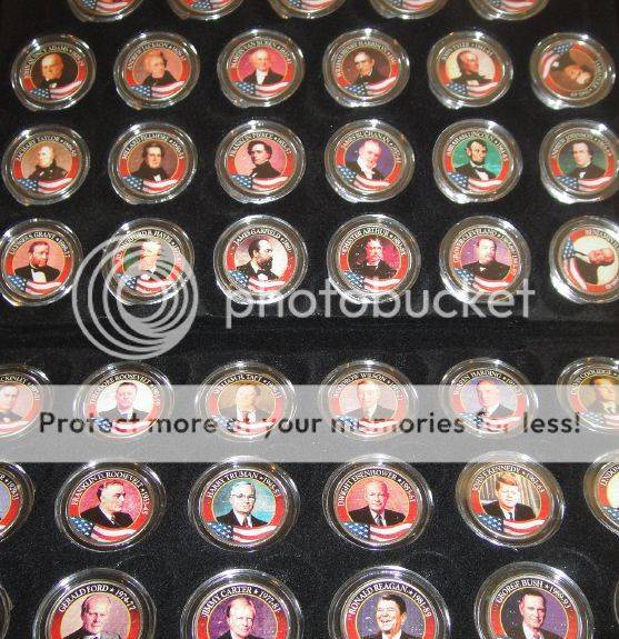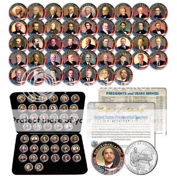 United States Presidential Quarters complete set consisting of 43 beautifully colorized District of Columbia Quarter Dollar US Coins featuring all United States Presidents up to Barrack Obama.