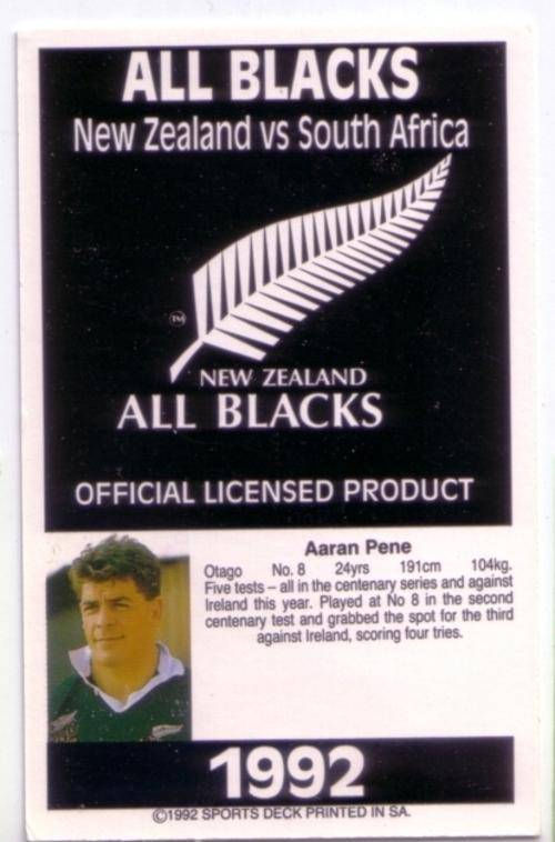 ALL BLACKS NZ vs SA 1992 Rugby Trading Card - Aaran Pene
