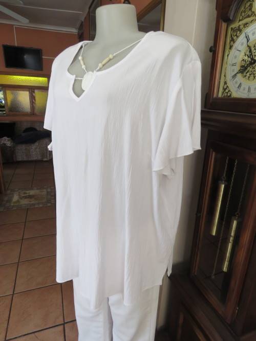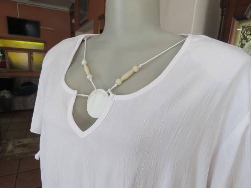 All in white!!Throw over top in creased polyester.Size 52/28 by 'DONNA CLAIRE'.Decollete neckline.Attached necklace with beads and large shell circle.Short flare sleeves with open shoulders. Slitted sides.As new.
