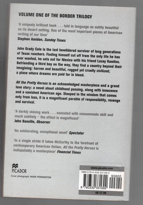 All The Pretty Horses is an acknowledged masterpiece and a grand love story: a novel about childhood passing, along with innocence and a vanished American age. Steeped in the wisdom that comes only from loss, it is a magnificent parable of responsibility, revenge and survival.