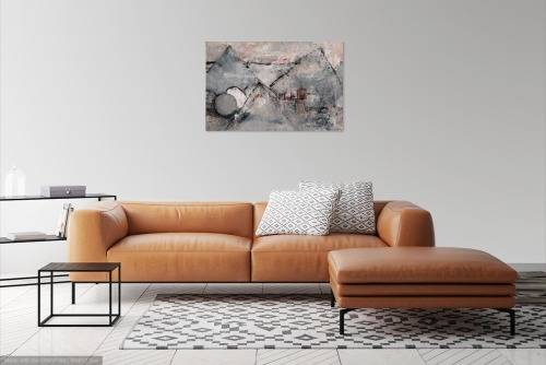 "Inspired by the architectural shelter design without boundaries. The dwelling place of all people mostly consist of a roof on walls of some sort. This painting reminds me of the basic shelter that we all need, safe at night from the night. The colours are warm & cool with neutral balance. For art lovers who appreciate the design of shape & texture combinations. Heavily roughly detailed at close range & softly blending at a distance allows for a variety of hanging spaces in rooms with lots of light where people will have 'lingering longer' view time to fully appreciate this painting - A.Kuhnel