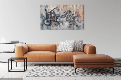 "Inspired by the free flow of architectural design without rules. An intense sense of old & new is present as the colours are soft & warm yet sharp in design. For art lovers who appreciate the design of shapes & textures combined . Moderatly detailed at close range & softly blending at a distance allows for a variety of hanging spaces in rooms with lots of light where people will have 'lingering longer' view time to fully appreciate this painting - A.Kuhnel