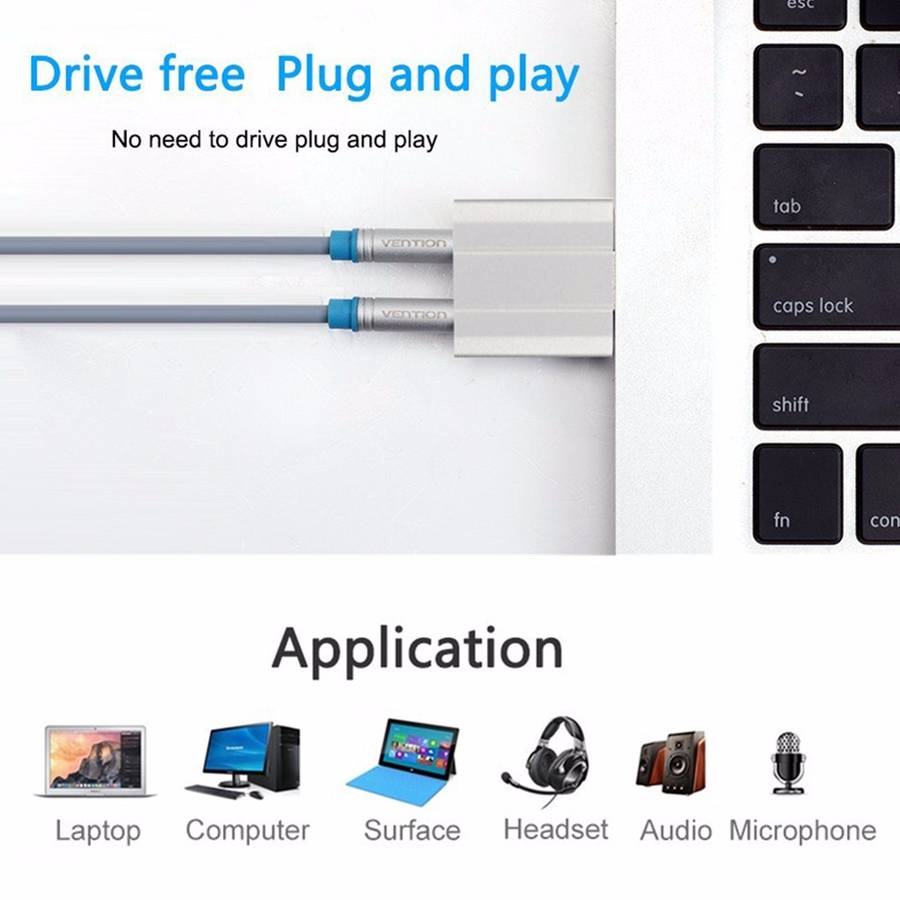 1. Support 5.1Ch 2. Support USB2.0 interface, plug and play, drive free 3. Support system windows XP, Vista / WIN7 / WIN8/WIN10, MAC /LINUX 4. Support 3.5MM conventional interfaces 5. Using original chip HS-100B, low-power, high-quality chip requires no external power supply 6. The sound output via USB to your speakers, headphones 7. Mmicrophone input to the computer via USB, desktop