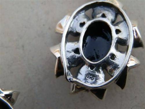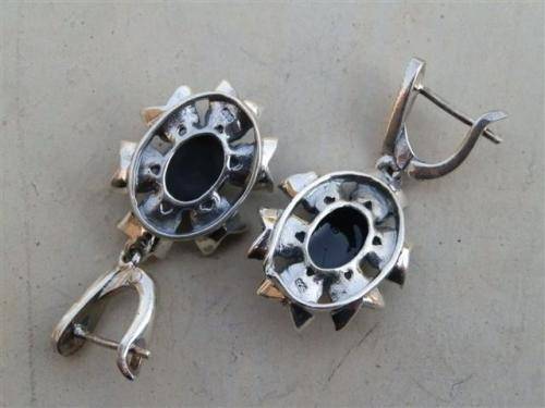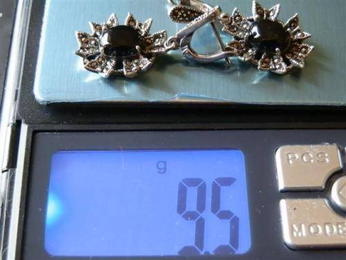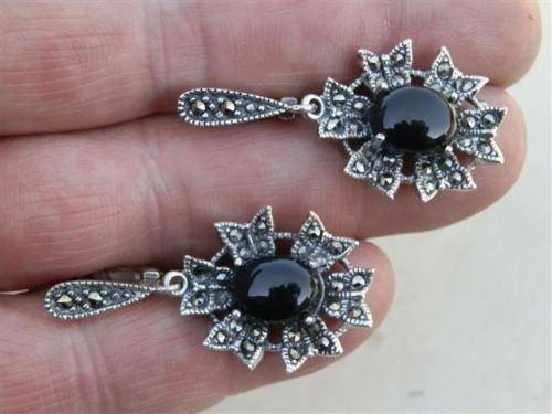 Fabulous sterling silver earrings with black stones and marcasite accent, marked 925 and in good condition. The size is 18 x 37 mm and the total weight is 9.5 g. Magnificent!!
