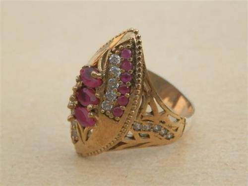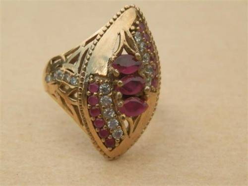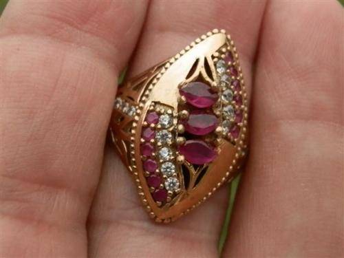 Fantastic sterling silver ruby ring with clear stone and bronze accent, marked 925 and in good condition.  The size is  19 mm, the top width 25 mm and the weight 7.89 g.  The hardness of the 15 rubies is 9 on MOHS scale.  Yes!!