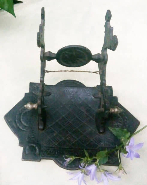 Almost antique, miniature Queen cast iron stove, either a childs toy or perhaps a trademans sample. In excellent condition, just a minor clean up....height 15cm which includes the chimney, width 12cm which does not include the side attachment, depth 9cm.