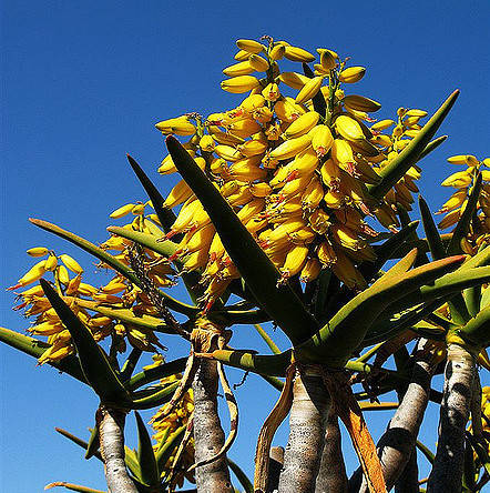 Also known as the Quiver Tree. Native to South Africa, specifically the northern Cape and parts of southern Namibia. This distinctive tree aloe has smooth branches, which are covered with a thin layer of whitish powder that helps to reflect away the hot sun's rays. The bark on the trunk forms beautiful golden brown scales, but beware, the edges of these scales are razor sharp. The crown is often densely rounded as a result of the repeatedly forked branches, hence the species name dichotoma (dichotomous meaning forked). The blue-green leaves are borne on terminal rosettes, but in juvenile plants the leaves are ranked in vertical rows. The bright yellow flowers are borne from June to July.