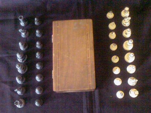 A VERY OLD CHESS SET FROM THE 1920'S. THE PIECES ARE MADE OF LEADD AND PAINTED IN BLACK AND WHITE. THE ONE BLACK HORSE HAS BEEN GLUED TOGETHER. ALL THE PIECES ARE THERE, PAINT WORK IS NOT PERFECT BUT IT IS STILL THE ORIGINAL PAINT. IT COMES IN A LOVELY EDWARDIAN WOODEN BOX, THE BOX IS STILL IN GOOD CONDITION. BOX - 17CM X 10CM X 6CM. SHIPPING WILL BE R30 IN S.A.