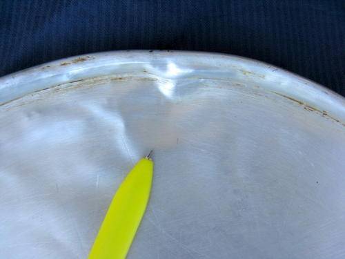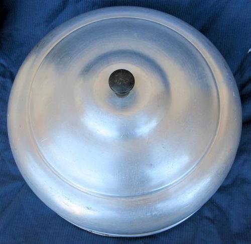 ALUMINIUM DOME & BASE : 27.5cm DIAMETER : 12cm HIGH : **NOTE DENTS (RIM NEEDS CLEANING)**