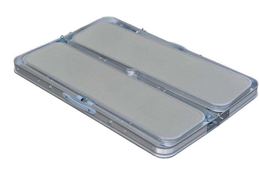The aluminium folding picnic table offers you a strong yet lightweight aluminum construction with solid bench for 4 adults. It is made from a aluminum and steel frame, the silver colour table top is very durable. With an easy to clean surface, this table can be folded into a flat case when not in use. The folded table is compact and comes with carry handles, which makes it very easy to carry.