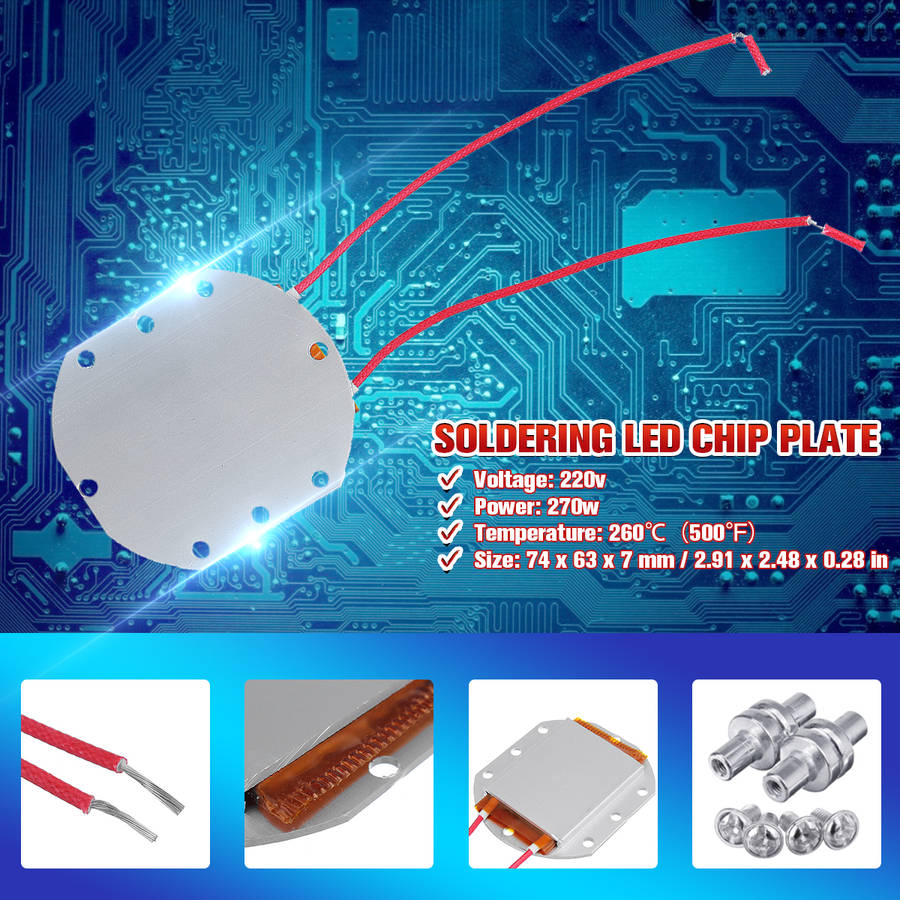 Features: a Automatic constant temperature, fast welding. a Multifunctional PTC lamp beadschipsBGA desoldering board. a It is composed of high-performance and high-power PTC heating plate and heat sink aluminum sheet, directly AC220V power supply. a No need to use a thermostat. The predetermined temperature can be reached in thirty seconds. Specification: Material: Aluminum alloy +PTC Color: Silver Voltage: 220v Power: 270w Temperature: 260a500a Size: 74 x 63 x 7 mm / 2.91 x 2.48 x 0.28 in Package included: 1 x Soldering Chip PlatePOWER CORD NOT INCLUDED 4 x Screws Base 4 x Screws Details Pictures: