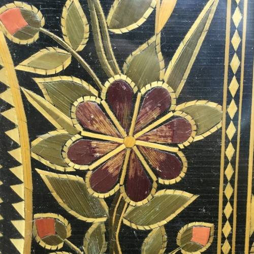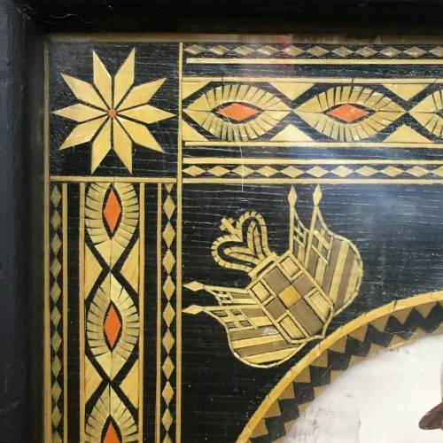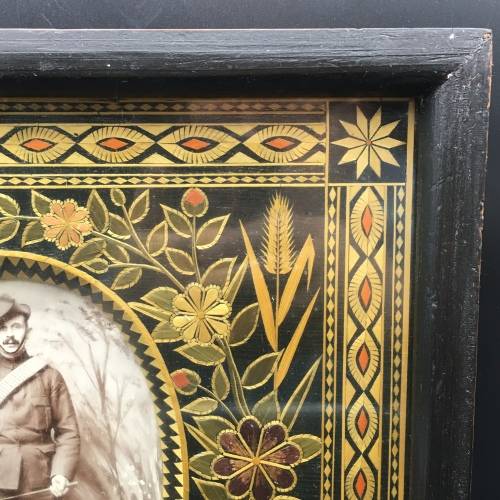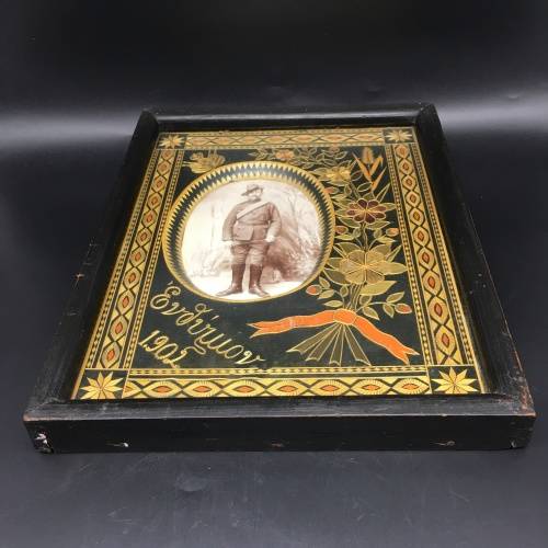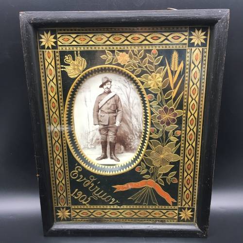 This amazing, rare, large, hand-made 'Prisoner-of-War' photo frame is extremely well made and must have taken months to complete. What's amazing and rare about this frame, is the amount of work that would have gone into making it, and the fact that it was made by a Greek volunteer. There are literally hundreds of tiny cut-out pieces used to put this beautiful frame together to form the borders, flowers, petals, wording, flags and dates etc. in various colours. All of which is behind glass, which has preserved it beautifully, then nicely framed in a solid dark wood. The frame features the original photograph of a soldier in uniform, who was probably a Greek volunteer who served during the Boer war and became a POW (I've read there were several Greeks who volunteered to serve on both sides). The frame also features the words 'Souvenir 1902' in Greek, as well as the Greek flags in the top right-hand corner, and a bunch of flowers and wheat tied with orange ribbon along the right-hand side. Around the inside of the wooden frame, there's a very wide decorative border, with flower motifs in the corners. The photo frame is in great condition for its age, and the original photograph is nice and clear. The frame measures 32,5cm x 26,2cm x 3,2cm.