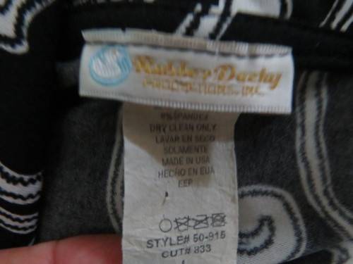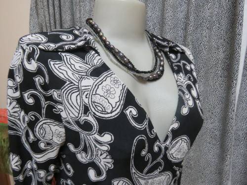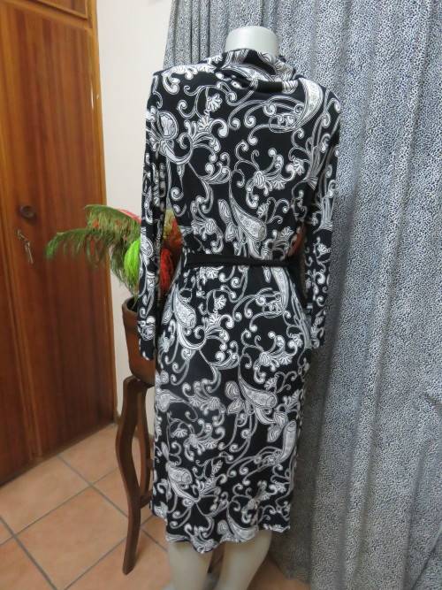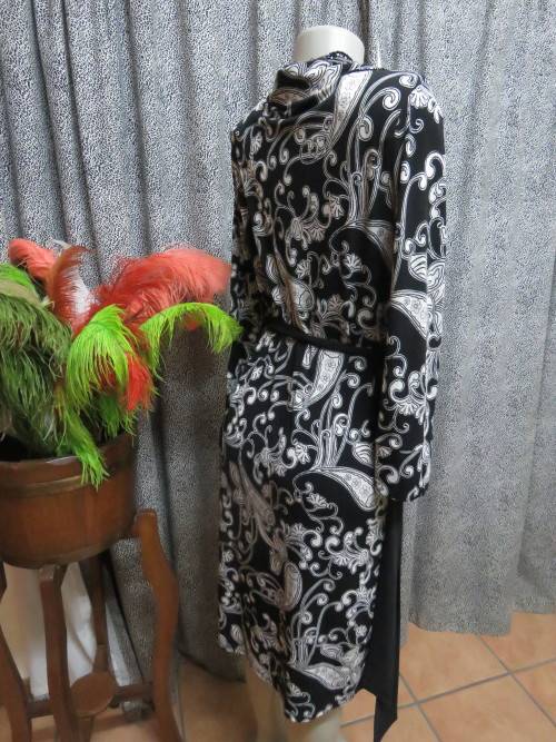 Amazing monochrome dress patterned in paisley design.Size 35/11 by 'RUBBER DUCHY'.Made in U.S.A.Wrap around style.In stretch polyester fabric.Long sleeves.Black straps to tie.New condition.