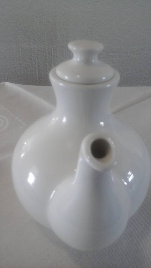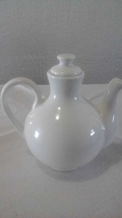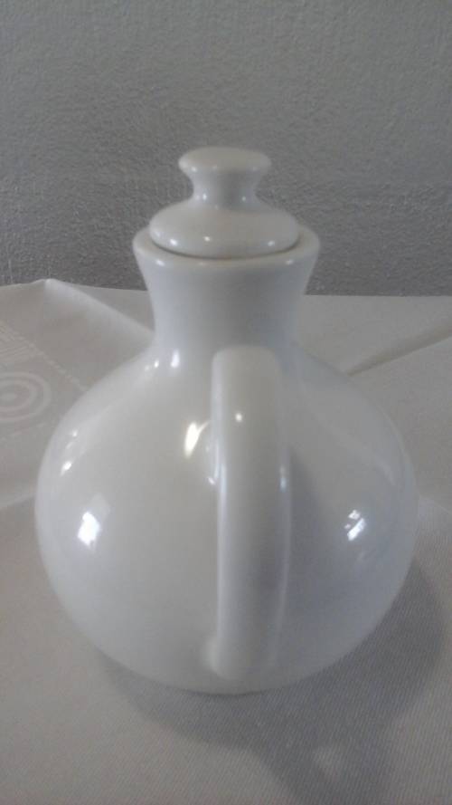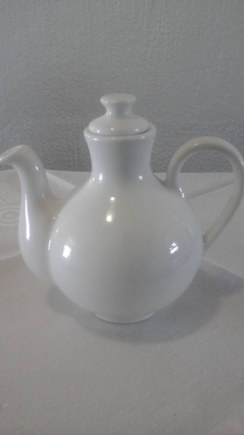THE TEAPOT IS MADE FROM PORCELAIN, IT IS POT BELLIED IN SHAPE AND WHITE IN COLOR.