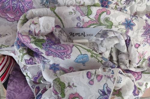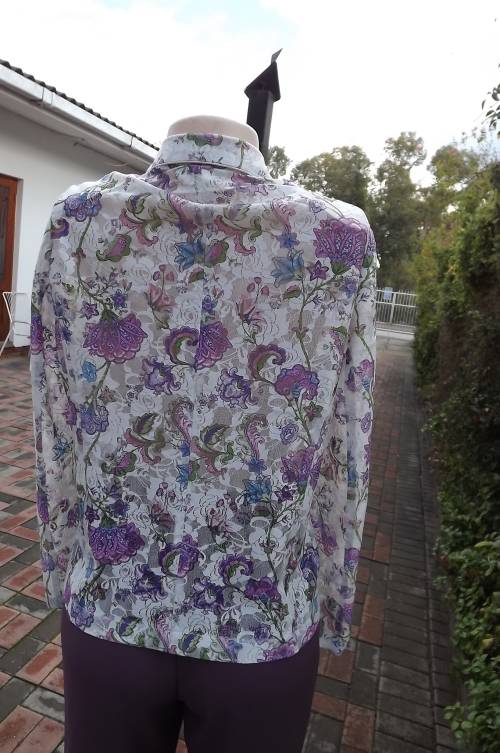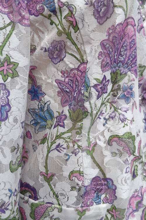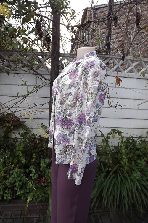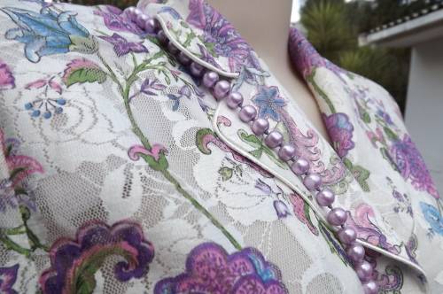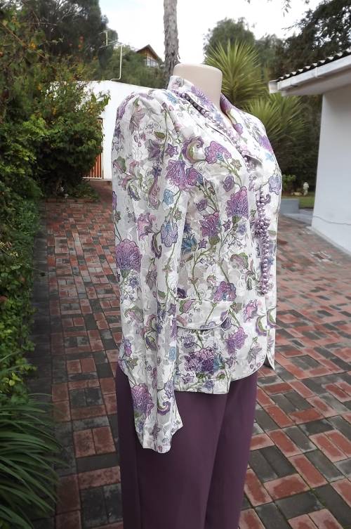 Amazing white acrylic lace jacket with a medley of purple/pink flowers.By Monzl size 36/12 see-through fabric.Two dummy pockets on front.Edging in white satin.Open collar with button down front.New condition
