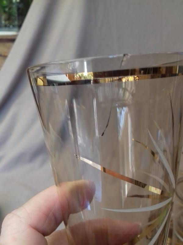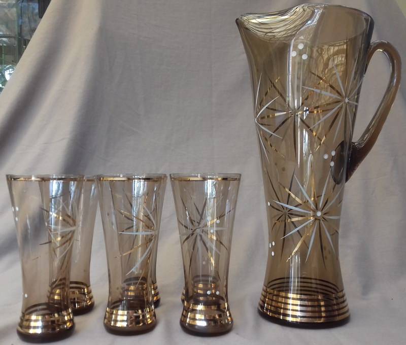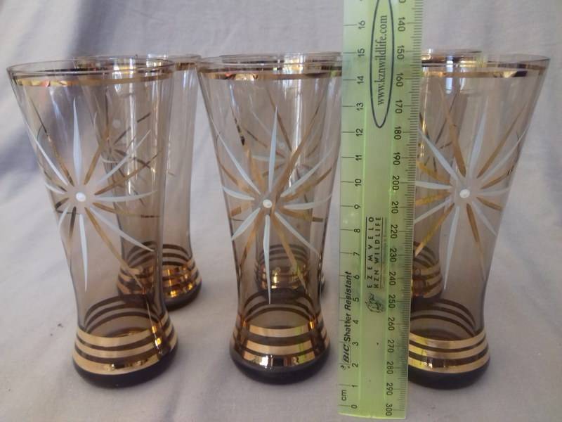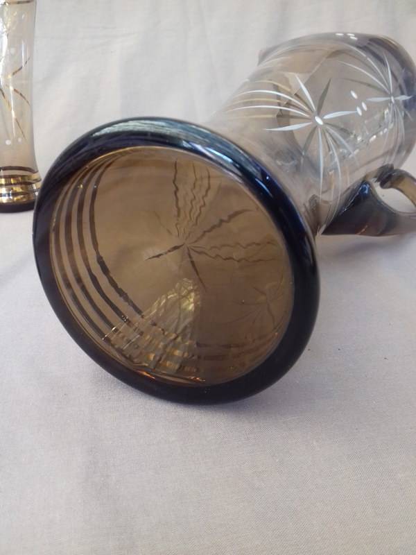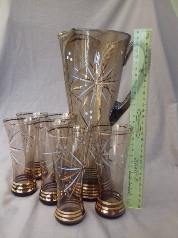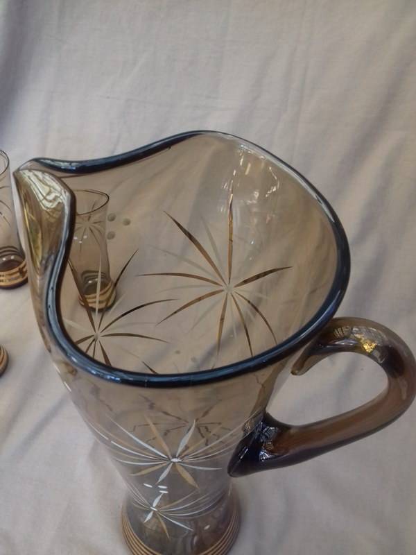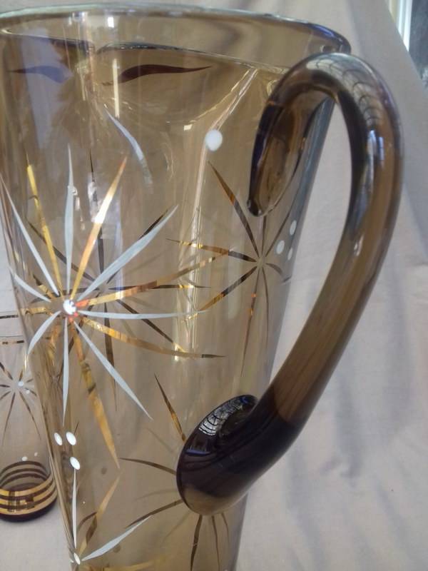 Could these be Czech glass? This really elegant graceful Cordial set in amber glass has gold bands and star bursts in gold and white. The jug is hand made and has an ice lip. I learned today that this is the correct name for jugs that have the pouring spout pressed in to prevent ice from plopping into the glass when the cordial is poured out. Quite ingenious. This set is in good used vintage condition. Please note there are 5 good glasses. There is a 6th glass, but as you can see in the last photo, it has a bad crack. I will include it free of charge.
