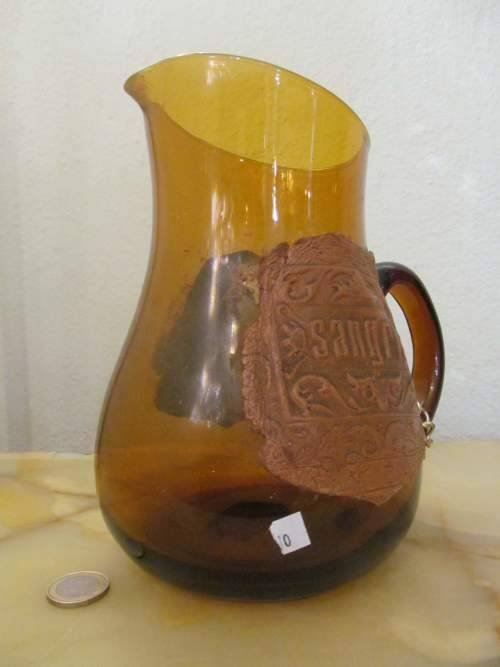 MANUFACTURED FROM AMBER COLORED GLASS AND DESIGNED WITH A RIM SLOPED DOWN TOWARDS THE HOLLOWED C-SCROLL HANDLE ATTACHED AT THE LOWER END OF THE BODY, THIS VINTAGE ITEM IS A GLASS WATER PITCHER / JUG WHICH HAS BEEN DECORATED WITH APPLIED LEATHERETTE PORTIONS ON BOTH SIDES, EACH EMBOSSED WITH A SCROLL PATTERNING ALONG WITH THE WORD - "SANGRIA"