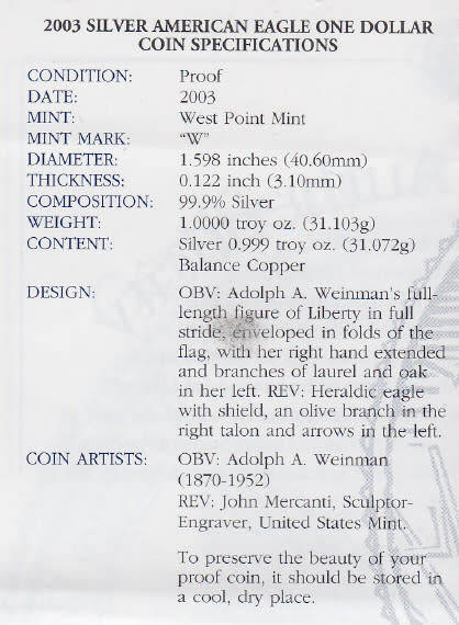 American Eagle : One Ounce Silver Dollar of 2003 : West Point Mint
