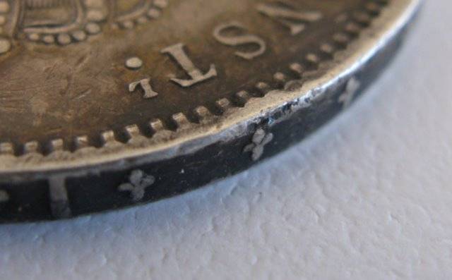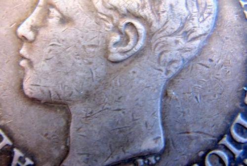 This 1898 Spanish coin has a ding on the rim and scratches on face of coin.