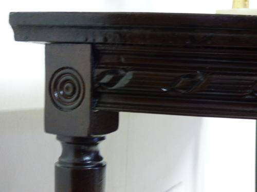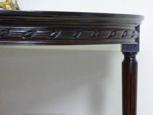 THIS BEAUTIFUL AND VERY ELEGANT "HALF MOON" TABLE WITH LOVELY DETAILING ON THE FRONT AND SIDES IS PERFECT FOR AN ENTRANCE HALL OR ANY FORMAL LIVING AREA, PERFECT TO DISPLAY THAT SPECIAL FEATURE PIECE. THE TABLE MEASURES 39cm x 77cm x 76cm HIGH. THE TABLE IS CLASSY AND A DEFINITE EYE-CATCHER.