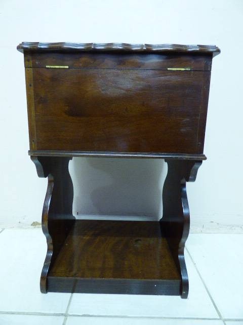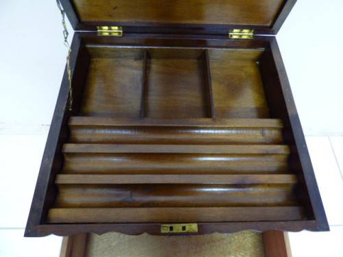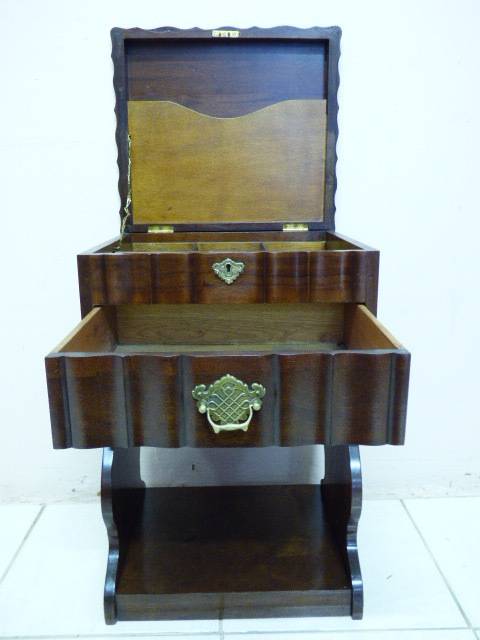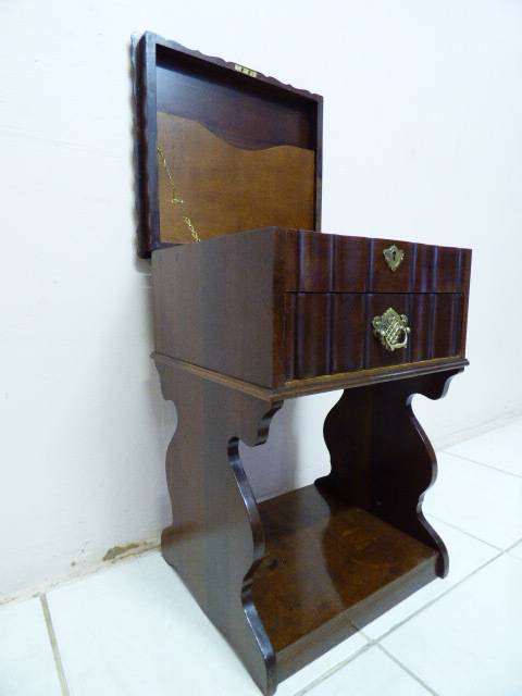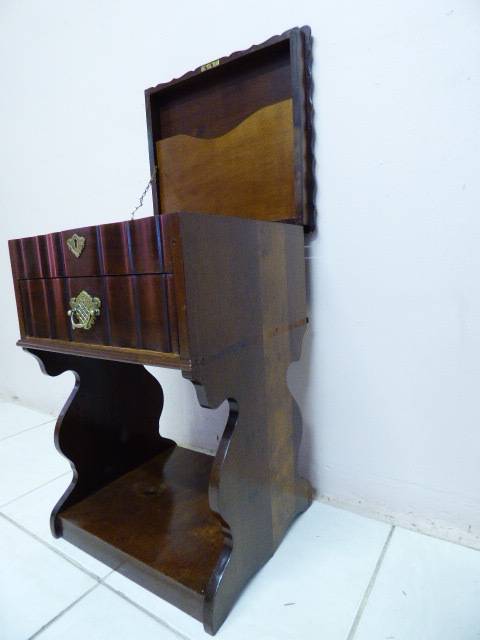 A VERY BEAUTIFUL AND UNUSUAL SOLID IMBUIA SIDE TABLE (WRITING) PEDESTAL. THIS PEDESTAL WITH A LIFT UP LID WITH A POCKET FOR PAPERWORK AND COMPARTMENTS FOR PENS AND SMALLER STATIONARY IS VERY UNUSUAL AND NOT ONE WE HAVE COME ACROSS BEFORE. IT WILL ADD A WHOLE LOT OF CLASS AND STYLE TO YOUR ROOM. IT HAS A DRAW AND IS VERY STABLE ON THE GROUND!!! THE SIZE IS APPROXIMATELY 39cm x 46cm x 67cm HIGH. Please note that on the one side the beading is not there as seen in pics 8 and 10.