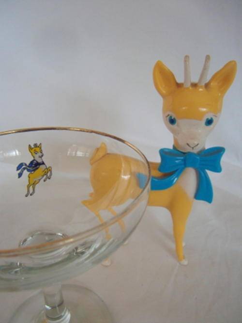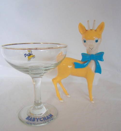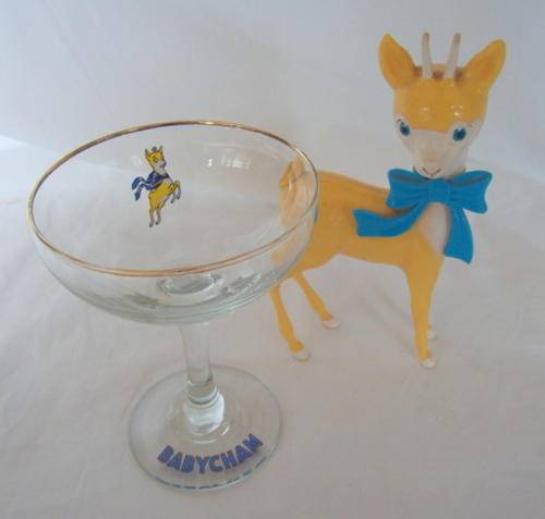 AN ADORABLE PAIR - A BABYCHAM GLASS AND BOKKIE