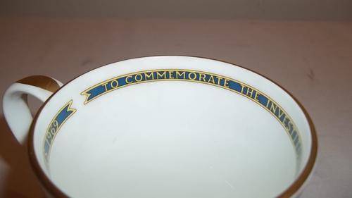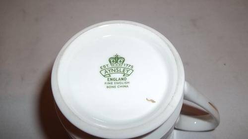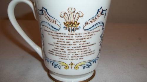 THIS AMAZING AYNSLEY OF ENGLAND FINE BONE CHINA CUP IS A COMMEMORATIVE CUP TO HIS ROYAL HIGHNESS, THE PRINCE OF WALES. THE FRONT OF THE CUP HAS THE PRINCES COAT OF ARMS AND THE BACK OF THE CUPS HAS A LIST OF ALL THE PRINCES OF WALES SINCE EDWARD II (1301) TO THE CURRENT PRINCE CHARLES (1958). THE INSIDE OF THE CUP HAS "TO COMMEMORATE THE INVESTITURE OF H.R.H. THE PRINCE OF WALES 1969" CIRCLING THE RIM. AN AWESOME PIECE FOR A COLLECTOR OF ROYAL'S MEMORABILIA AND HAS NO CHIPS OR CRACKS. .