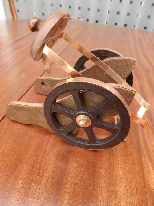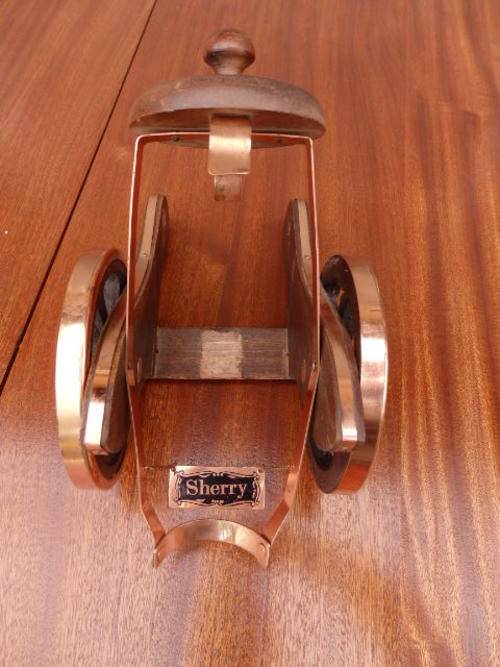 THIS IS AN AWESOME SHERRY POURER MADE OF WOOD WITH COPPER FINISHINGS. THE 750ml BOTTLE IS PLACED IN THE HOLDER AND IS ABLE TO SWIVEL AND POUR. THIS WOULD MAKE A REALLY AWESOME NOVELTY ITEM ON YOUR BAR.