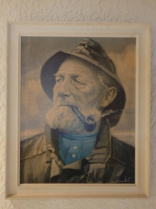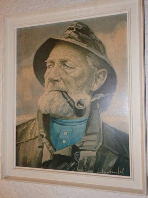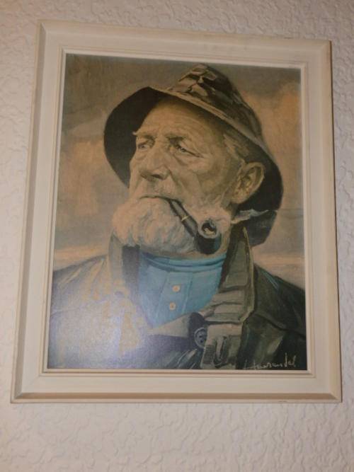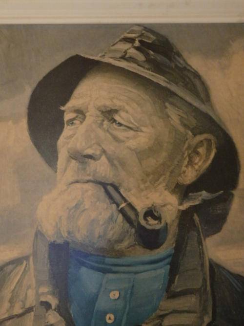 THIS AMAZING FRAMED PRINT OF AN OLD WHALING SEA CAPTAIN SMOKING HIS PIPE WITH HIS RAINCOAT AND CAP ON MEASURES 47.5cm x 58cm. THE WHALE CAPTAIN IS PAINTED WITH GREAT DETAILS AND HAS BEEN BEAUTIFULLY FRAMED IN A WHITEWASHED STYLE FRAME. THIS WOULD BE AN AWESOME PICTURE FOR A COASTAL HOLIDAY HOUSE.