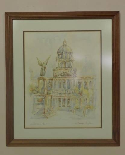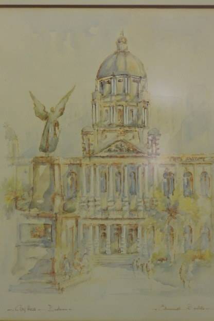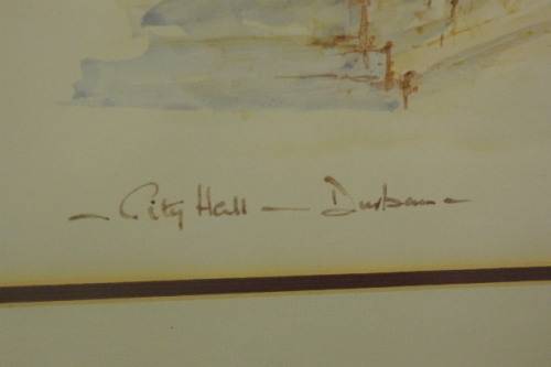 THIS STUNNING ORIGINAL WATERCOLOUR PAINTING OF "CITY HALL - DURBAN" BY INTERNATIONAL ARTIST EDMUND BARTON (LIVING IN SOUTH AFRICA) IS PART OF HIS HISTORICAL SOUTH AFRICAN BUILDING COLLECTION WHICH I BELIEVE WAS A SPECIFICALLY COMMISSION. THE PAINTING IS FRAMED BEHIND NON-REFLECTIVE GLASS IN A SOLID WOODEN FRAME. THE PAINTING IS IN BEAUTIFUL CONDITION AND MEASURES 570mm WIDE x 675mm HIGH. HIS APPLICATION OF COLOURS AND ATTENTION TO DETAILING MAKES THIS ENTIRE COLLECTION A MASTER PIECE. THE PAINTING IS SIGNED AND THE TITLE INSCRIBED ON THE PAINTING. YOU ARE WELCOME TO VIEW THE COLLECTION AT OUR EDENVALE BRANCH.