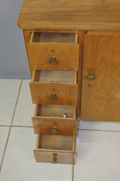 THIS ABSOLUTELY AMAZING VINTAGE (c1955) GERMAN MADE PFAFF 230 MANUAL SEWING MACHINE IS HOUSED IN A STUNNING WOODEN CABINET AND IS IN REMARKABLY GOOD CONDITION FOR ITS AGE. THE SEWING MACHINE IS LOWERED INTO THE CABINET WHEN NOT IN USE AND THE PANELS ARE PUT IN PLACE TO MAKE A WONDERFUL TABLE. THE SEWING MACHINE IS A VERY SOUGHT AFTER MACHINE BECAUSE OF ITS EMBROIDERY CAPABILITIES AND MANY FUNCTIONS. RECENT REVIEWS STILL RATE THIS AS ONE OF THE BEST SEWING MACHINES EVER MADE AND ARE SOUGHT AFTER THE WORLD OVER. THEY ARE EVEN CATEGORIZED AS INDUSTRIAL STRENGTH SEWING MACHINES. . WE HAVE NOT TESTED THE MACHINE, BUT JUDGING BY THE CONDITION, I CAN NOT IMAGINE THAT THERE IS MUCH TO BE DONE ON IT OTHER THAN A GOOD SERVICE. THE CABINET HAS FOUR DRAWERS WITH AMPLE SPACE FOR COTTONS AND BOBBINS ETC. THIS IS GERMAN INGENUITY AND QUALITY AT ITS BEST. THERE IS A PLUG ON THE BACK OF THE MACHINE, BUT THERE ARE NO POWER CABLES AND EVERYTHING INDICATED THAT IT IS A MANUAL MACHINE. THE CABINET MEASURES 810mm LONG x 465mm WIDE x 770mm HIGH AND IS IN STUNNING CONDITION FOR ITS AGE.