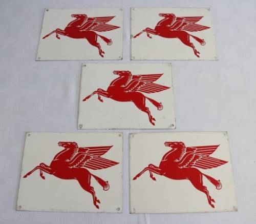 This amazing vintage red and white silkscreen Mobil Petroleum and Gas "Pegasus" flying horse wall sign is in amazing condition for its age and measures roughly 23cm long x 18cm high. The sign is a white powder-coat background with a red silk screened mid-century Mobile emblem. These wonderful old signs are scarce and had to find. We have four of these vintage signs available; all with fair vintage wear and tear. The price is per sign. Please view the pics carefully to fully appreciate this amazing vintage Mobil "Peggy the Pegasus" brand sign and to confirm their condition.