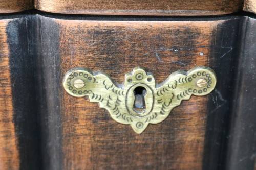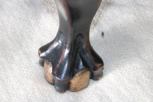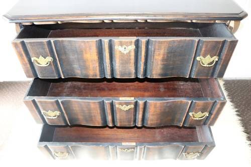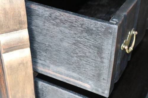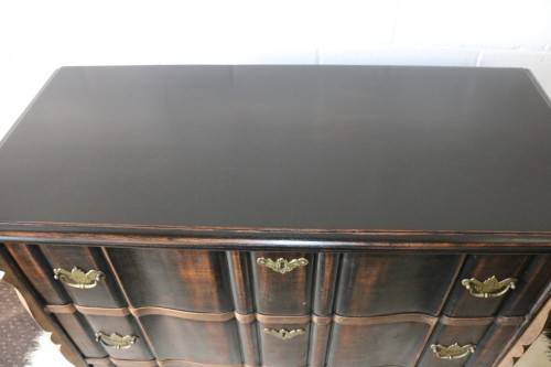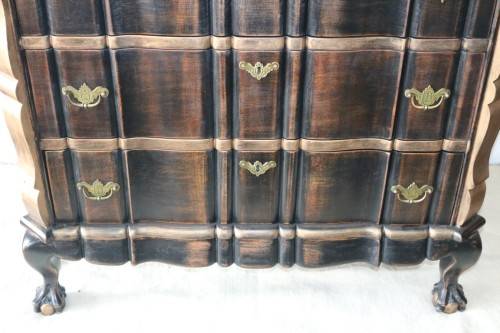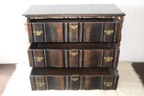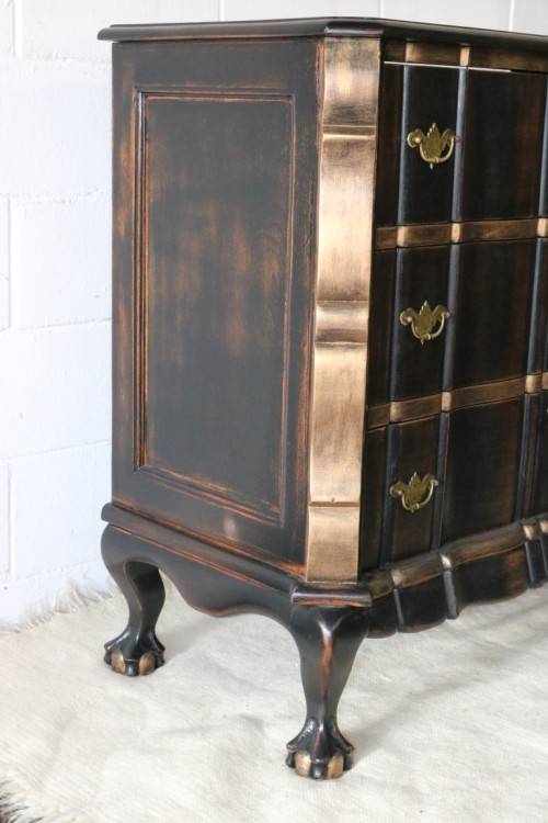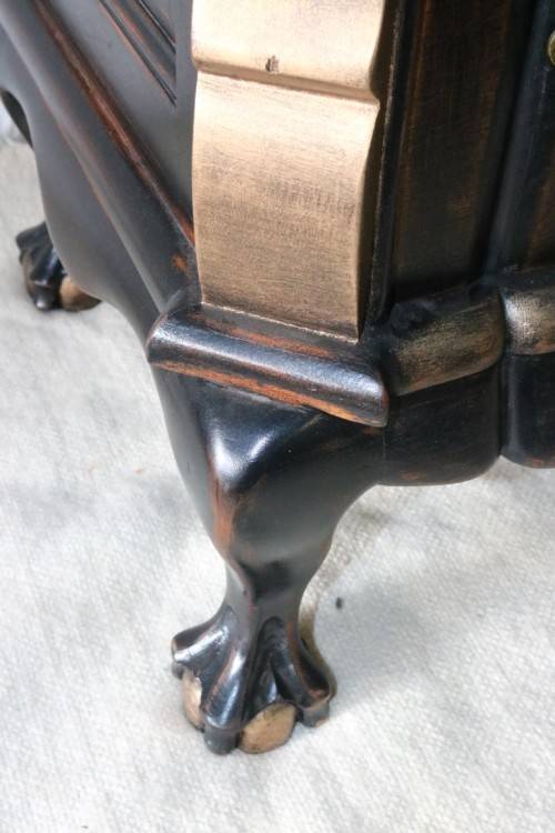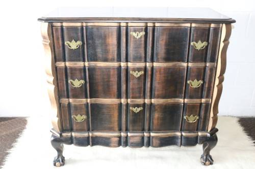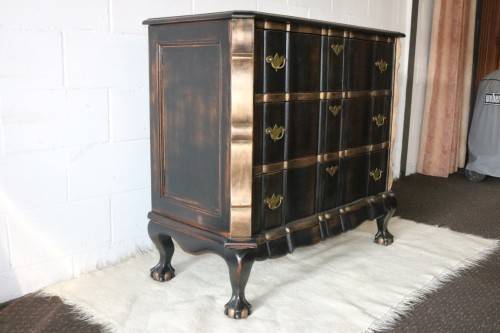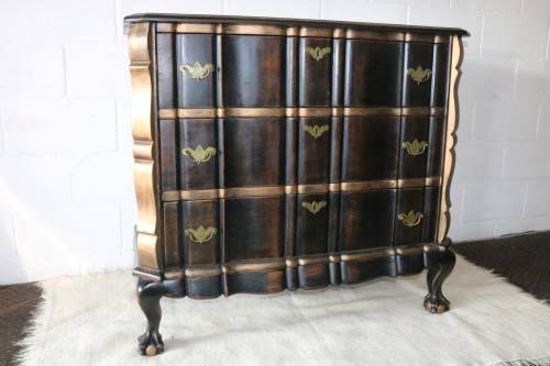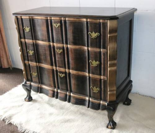 This lovely 3-drawer vintage chest of drawers is stylish, beautiful and perfect for any bedroom! The chest of drawers has three good sized drawers with loads of storage space for linen, etc. The chest of drawers has a black and gold paint technique that looks lovely but it and also be re-painted to suit your decor needs. The chest of drawers features lovely cabriole legs and ball and claw feet that really adds to the appeal of this piece. The chest of drawers measures 95cm long x 48cm wide x 95cm high. There is some age related scuffs on this beautiful chest but not hugely noticeable. Please view the pics carefully to fully appreciate this stunning chest of drawers and to confirm the condition.
