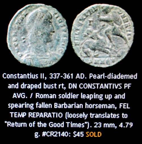 An ancient coin 1677 years old .Roman soldier spearing barbarian horseman.The internet example below is of coin from the same period.The coin on auction here is a bronze coin.