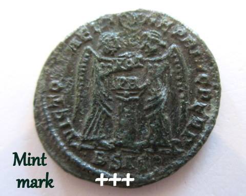 Constantine AE follis. 319 AD. IMP CONSTANTINVS MAX AVG, laureate and cuirassed bust right / VICTORIAE LAETAE
