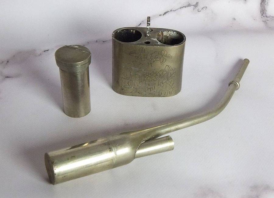 An antique Chinese opium pipe with engraved detail and makers marks for Hong Kong and Rui Xing Long