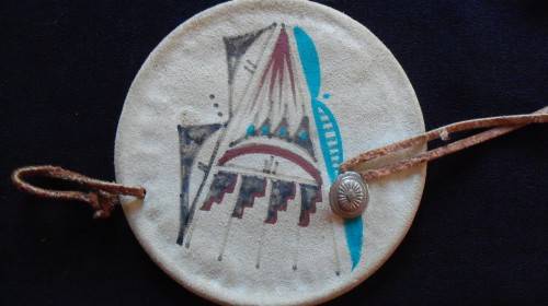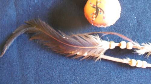 The rattle comes with a Certificate of Authenticity that is was handcrafted by Native Americans. It is made of wood and leather. It measures 18 cm in length. The "Dreamcatcher" is made of leather with beads and feathers, with what looks like a wigwam painted on it. It measures 13 cm in diameter and 60 cm in length. The small Indian chief is made of some kind of metal, there are no markings. He stands at 4 cm in height.