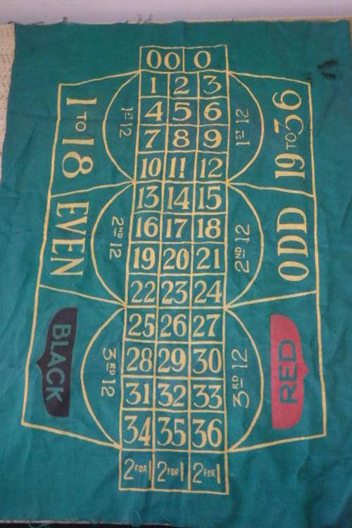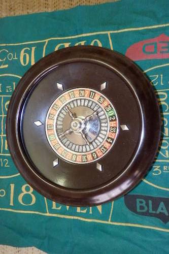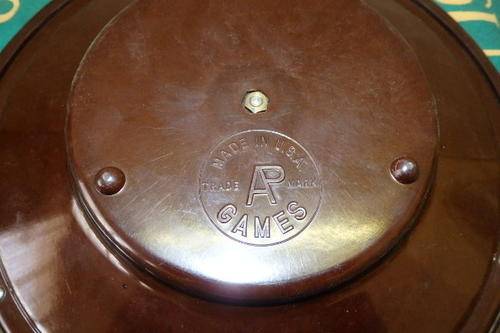 THIS AWESOME AMERICAN MADE MINIATURE BAKELITE ROULETTE WHEEL HAS A GREEN VELD "BOARD" AND IS PERFECT FOR A HOME ROULETTE TABLE FOR RAINY DAYS OR WHEN THE KIDS ARE ON HOLIDAY. THE WHEEL MEASURES 25cm ACROSS. PLEASE NOTE THERE ARE NO CHIPS BALLS OR DICE. THERE IS MINOR AGE AND UASGE RELATED WEAR AND TEAR.