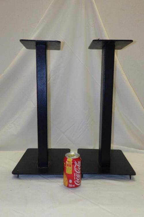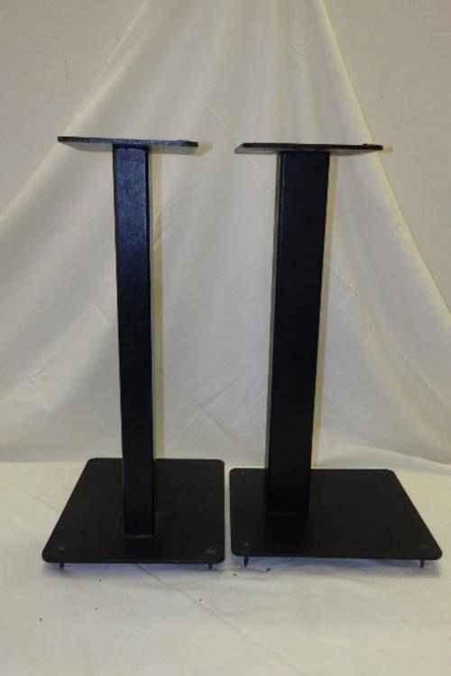 THIS AWESOME AND VERY PRACTICAL PAIR OF BLACK SURROUND SOUND/ SPEAKER STANDS EACH MEASURE 27cm LONG x 23cm WIDE (AT THE BASE) x 50.5cm TALL AND 16cm x 14.5cm AT THE TOP. THE BASES CAN BE MOUNTED INTO THE FLOOR. THERE IS MINIMAL AGE AND USAGE RELATED WEAR AND TEAR.