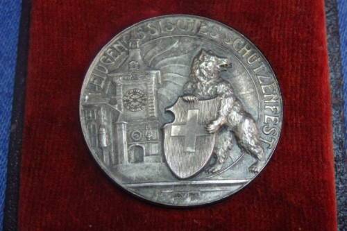 THIS AWESOME ANTIQUE "EIDGENOSSISCHES SCHUTZENFEST" (SWISS FEDERAL SHOOTING FEAT) 1910 MEDAL IS IN ITS EIDGENOSSISCHES SCHUTZENFEST BOX AND MEASURES 2.6cm ACROSS. THE MEDAL IS DATED 1910 WHEN THE SHOOTING FEST WAS HELD IN BERN. THE BOX HOWEVER IS DATED 1924 WHEN THE FEST WAS HELD IN AARAU. THE BOX HAS COME APART AT THE HINGE. IF YOU ARE A COLLECTOR, THEN THIS MEDAL IS A MUST FOR YOUR SHOOTING MEMORABILIA COLLECTION.